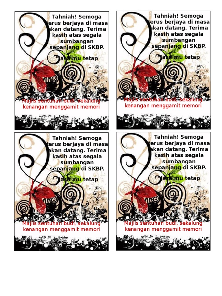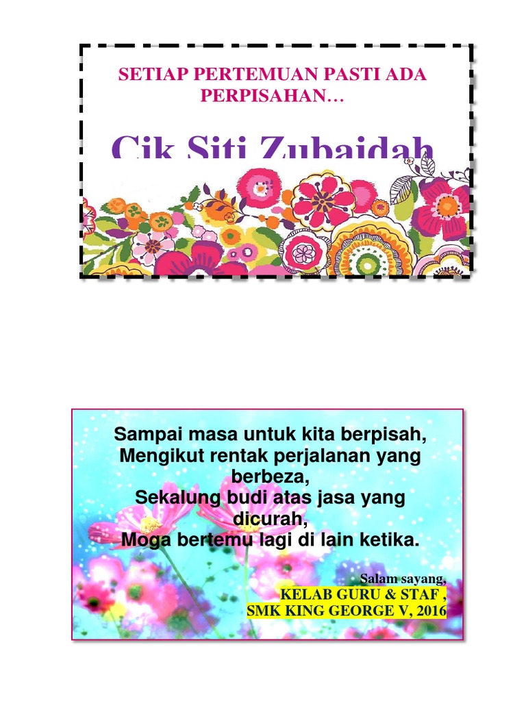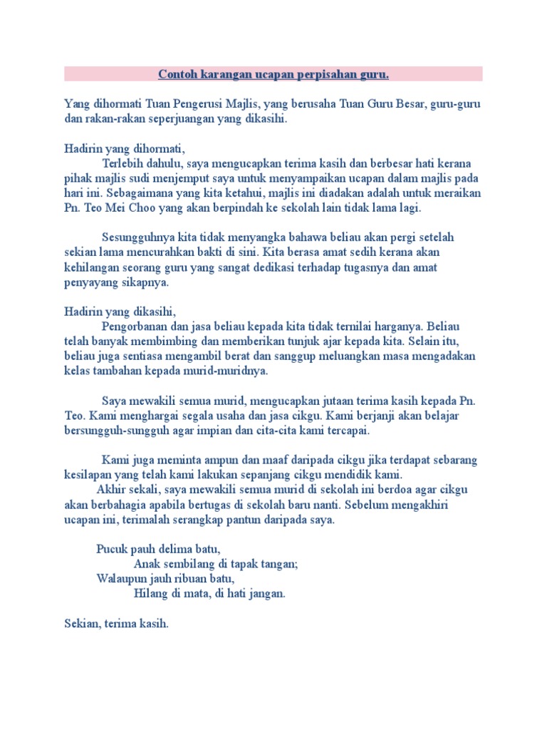 Aktiviti penghargaan seumpama ini pastinya dapat menarik aura positif dalam organisani dan. Jika hari ini seorang perdana menteri berkuasa,jika hari ini seorang raja menaiki takhta,jika hari ini seorang presiden. Tiada perkara yang lebih gembira daripada menerima kad ucapan tulus ikhlas daripada rakan atau orang tersayang. Kita masih boleh berhubung dan. Untuk itu, kita harus memberikan sebuah ucapan saat pensiun. Puan mashura binti mansor guru besar sk 2 kuala ampang. Ini semacam ucapan perpisahan untuk rekan kerja yang bertujuan untuk menyampaikan terima kasih dan menjaga hubungan baik antara anda dengan pihak lain yang selama ini telah bekerja sama dan membantu anda di kantor. Dalam ucapan saat pensiun, kita sebaiknya menambahkan doa kepada orang tersebut. Text of kad ucapan hari guru. Untuk menghibur dan mengenang perpisahan itu, maka kata kata mutiara tentang perpisahan di sekolah berikut ini bisa menjadi inspirasi anda. Kata mutiara perpisahan sekolah untuk guru mungkin anda tengah bersedih karena salah satu guru anda akan pergi berpisah dari sekolah anda. Mungkin aku akan melupakan pelajaran dari apa yang telah diajarkan kepadaku. Selanjutnya bisa anda tentukan akan menggunakan ucapan yang mana, entah itu terima kasih, penyemangat, harapan, motivasi dan lainnya.